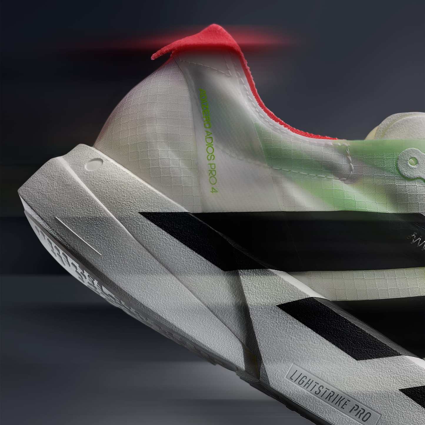 Proven to be the world's most winning shoe, the Adizero Adios Pro line is the pinnacle of Adizero Racing shoes. The Adios Pro 4 is made for fast runners who want to experience faster, with enhanced features designed to optimize running efficiency. Our carbon-infused ENERGYRODS 2.0 provide a seamless transition from heel to toe for a snappy, efficient stride. In the midsole, a new rocker point offers improved running economy. A double layer of our best-in-class ultralight LIGHTSTRIKE PRO ensures cushioning for every quick stride you take, helping you maintain energy over the long term. The shoe rides on an outsole built with Continental™ rubber for a no-slip transition during toe-off, as well as LIGHTTRAXION, designed to reduce weight without sacrificing grip.