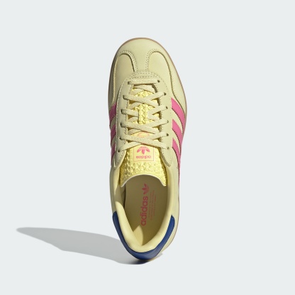 Slip into iconic style and comfort with these colorful Gazelle Indoor Shoes. Originally designed as an indoor training shoe in the '70s, this updated version features a nubuck upper in vibrant hues. The iconic T-toe overlay, gold-letter branding and serrated 3-Stripes put on the finishing touches. A plush lining surrounds your foot in comfort, while the rubber sole with gum rubber wrap provides grip for all-day wear. Blending retro design and modern comfort, these Gazelles inject a lively color scheme into your everyday style.