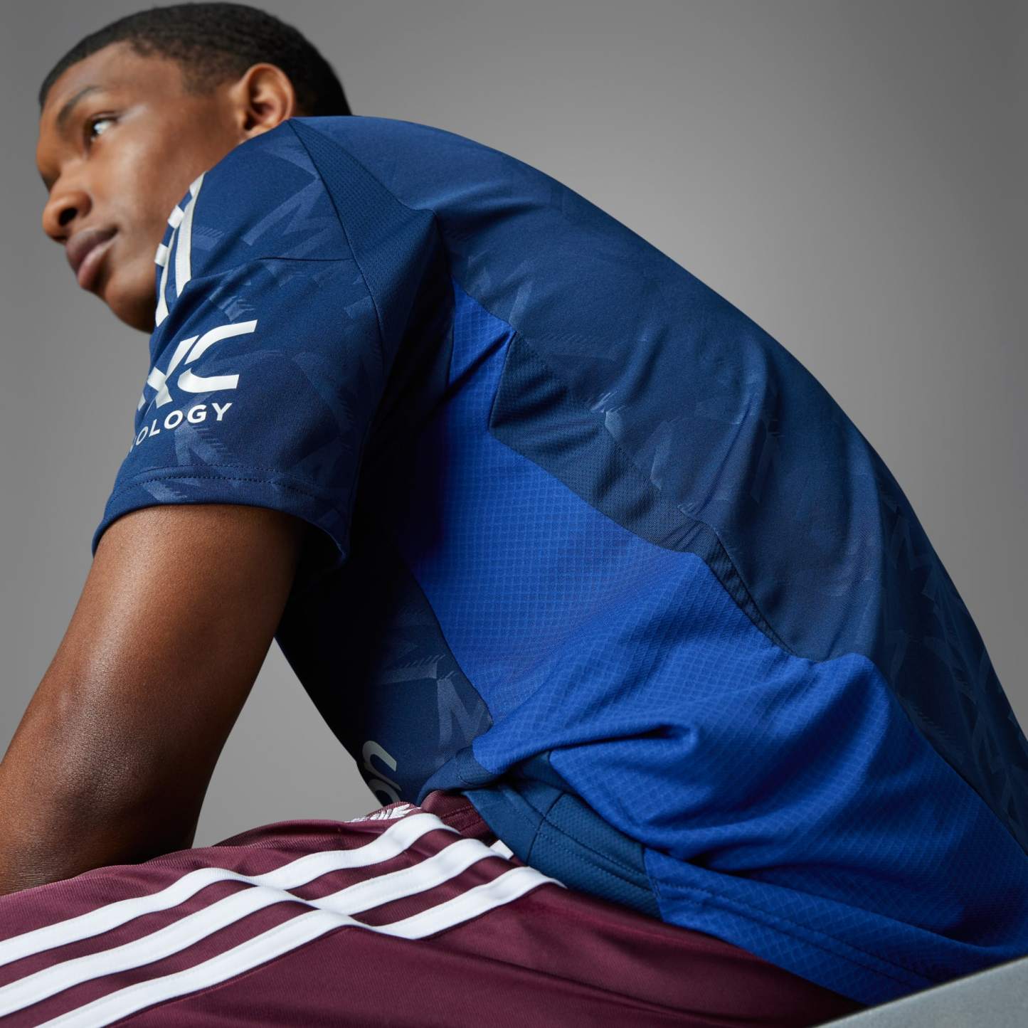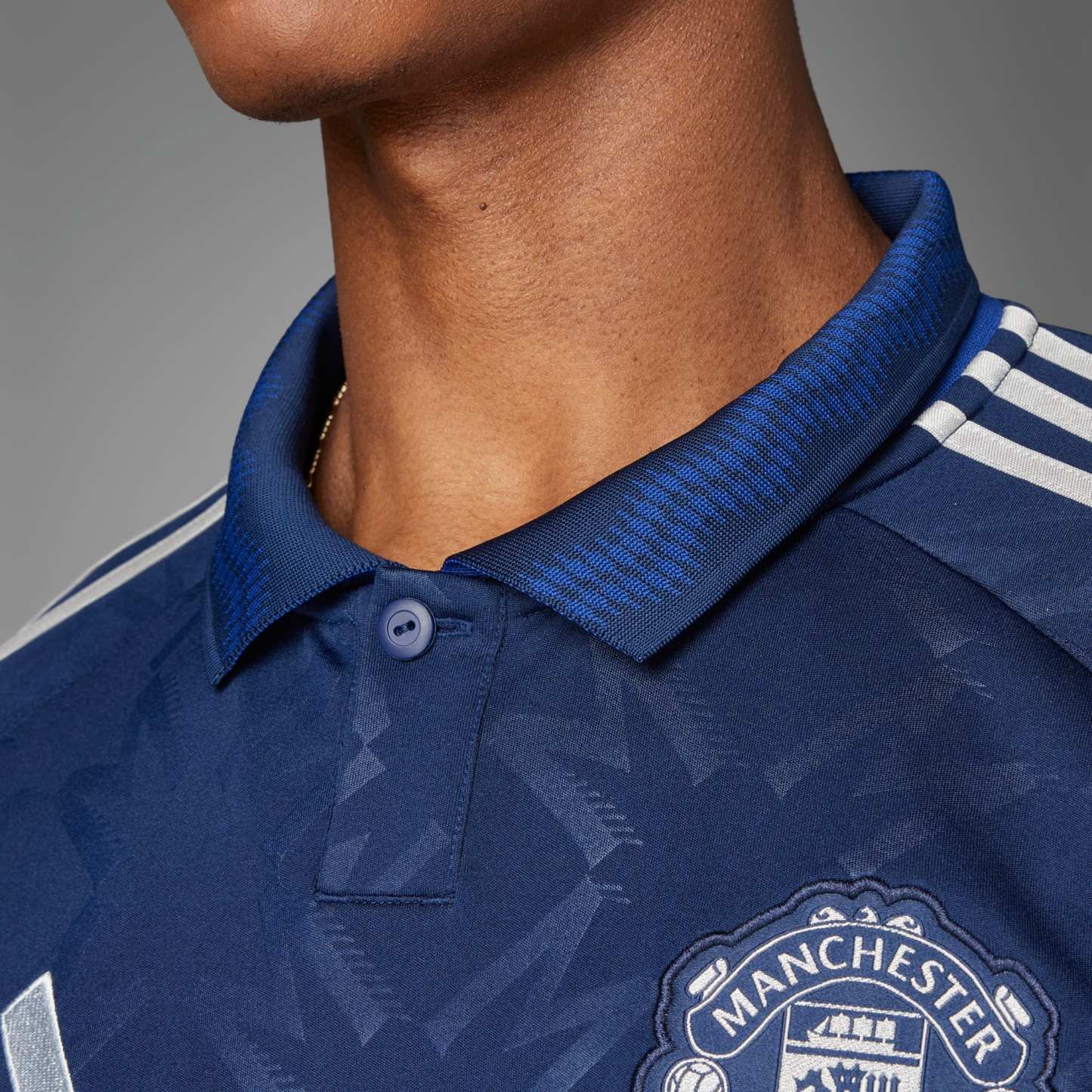 With a bold design that nods to soccer culture, this adithtdas Manchester United jersey looks equally at home on and off the pitch. Silver details pop against an indigo base that also includes a subtle, repeating "M" monogram. The light blue graphic on that stylish polo collar pays tribute to the river on which Old Trafford sits. Moisture-managing AEROREADY keeps fans comfortable on away days.This product is made with 100% recycled materials. By reusing materials that have already been created, we help to reduce waste and our reliance on finite resources and reduce the footprint of the products we make.