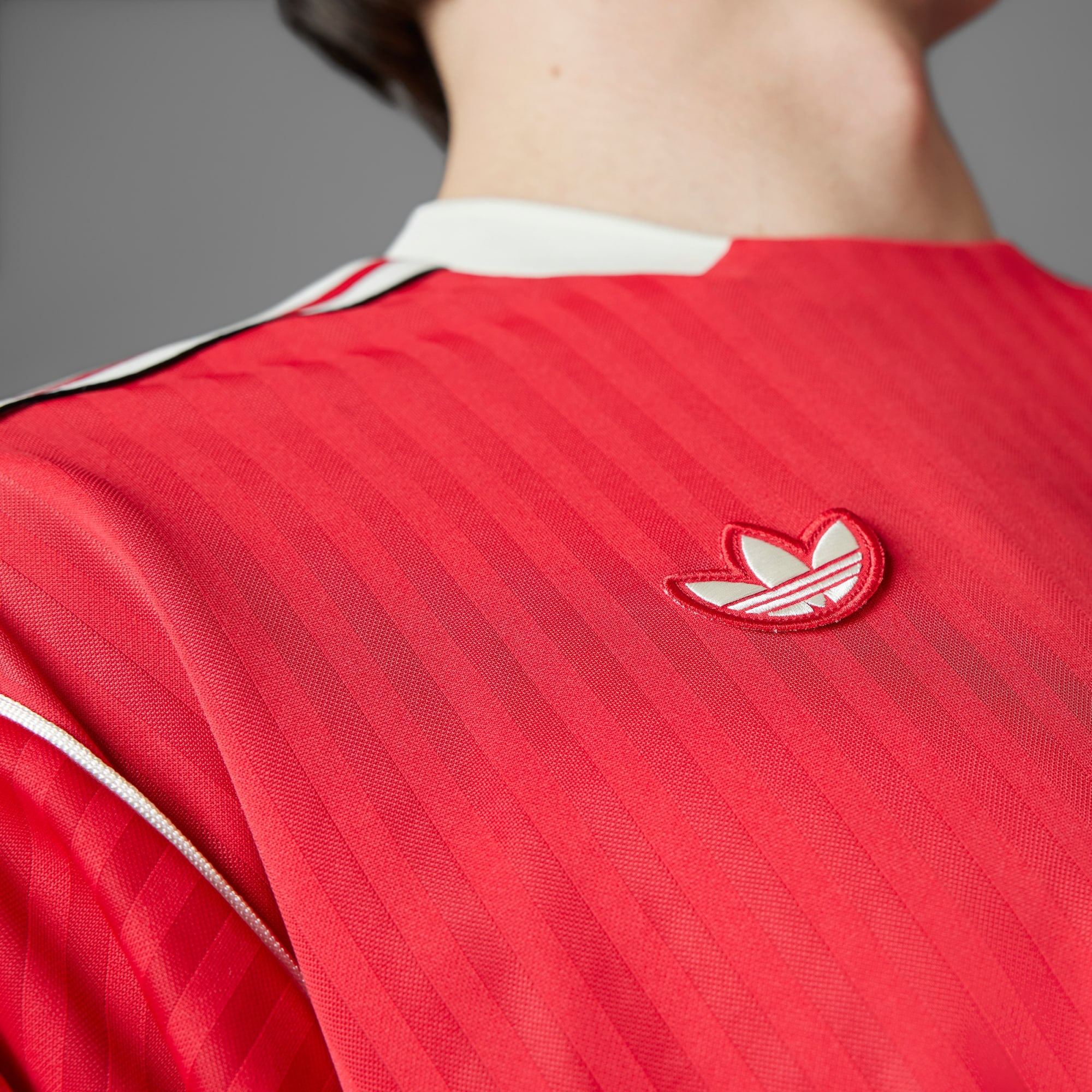 A soccer jersey with '80s stadium style, made with recycled materials.